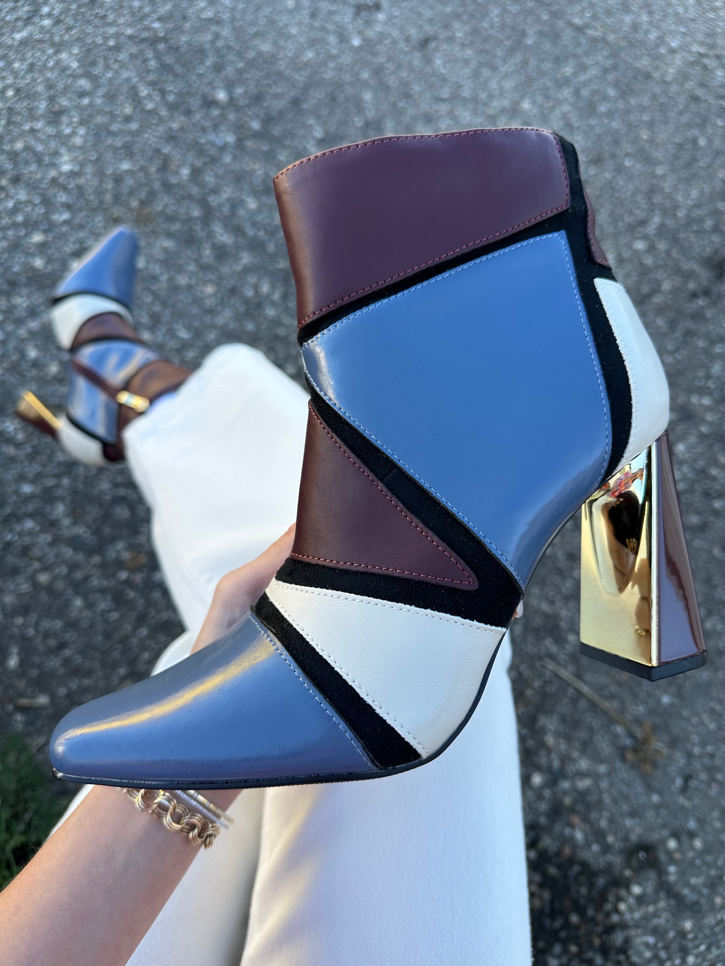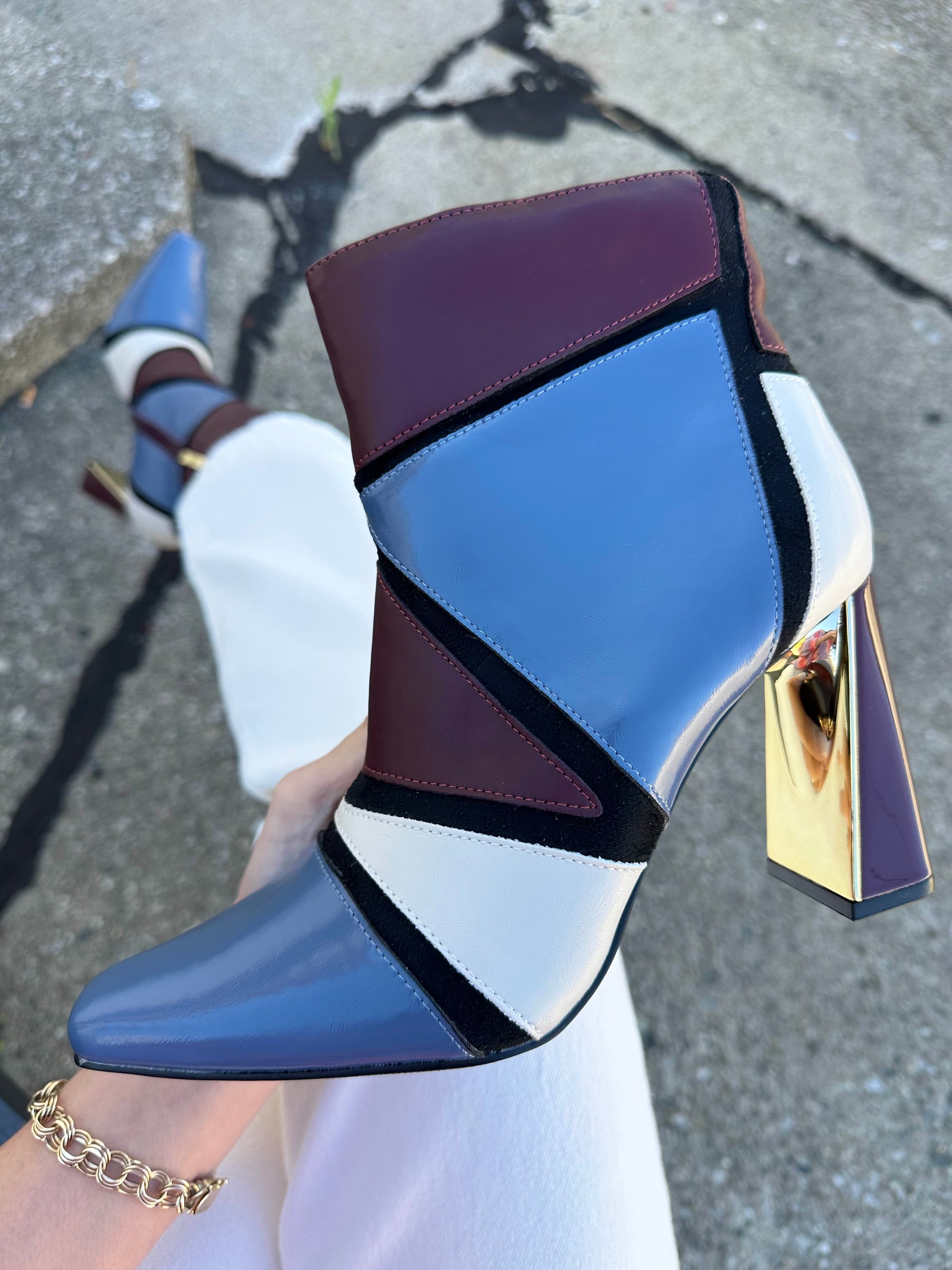 You'll be sure to make a stylish statement in the Feebe bootie from Ninety Union. This ankle boot features a patchwork upper with a tapered square toe and metallic accent on the block heel for added drama.