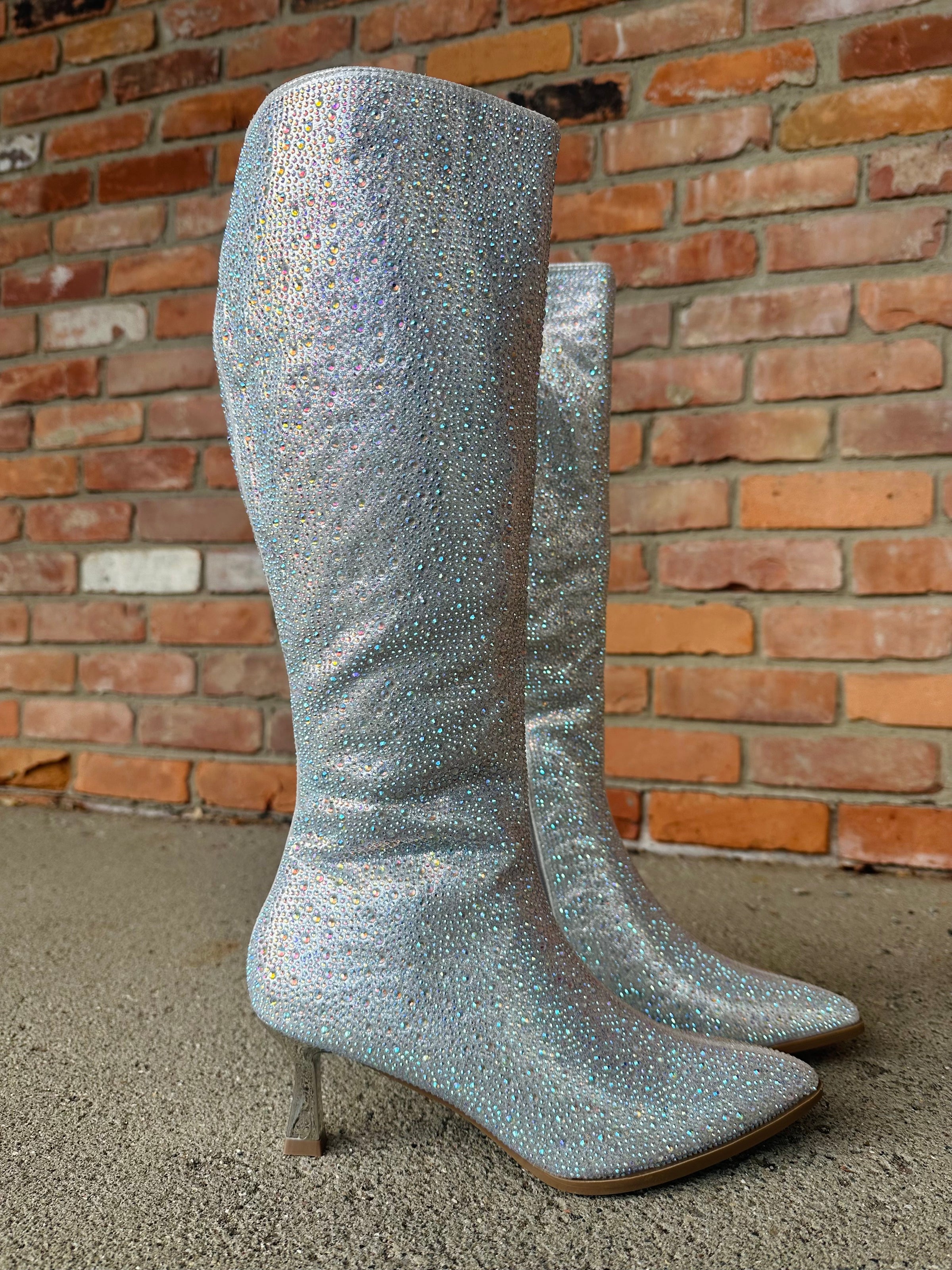 The rhinestone tall boot you’ve been searching for. Featuring a low heel, making these super comfortable. Easy style to dress up or down all season long.