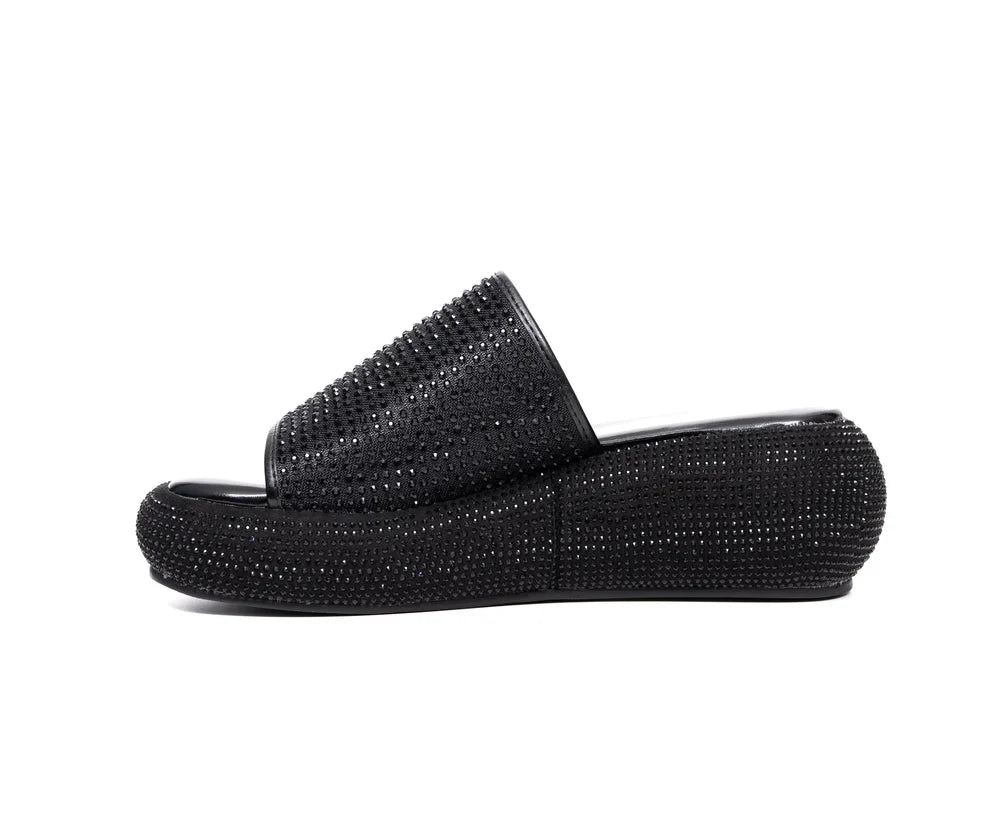 Go big with bling in this spectacular open-toe sandal covered in rhinestone embellishment. The pointed toe, delicate straps, and full sparkle coverage create a show-stopping look that commands attention.