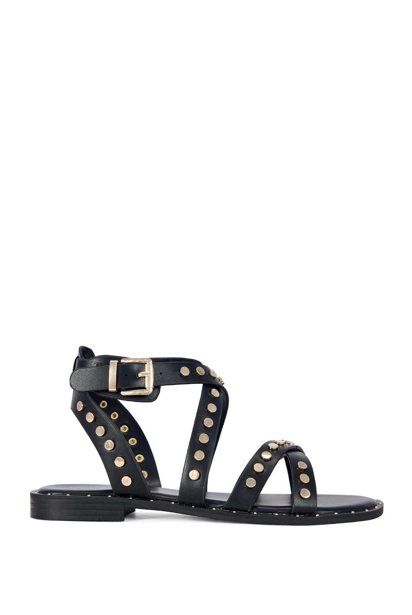 Your Sole's Rock n' Roll Era! Unleash your inner rockstar with these edgy, biker-chic sandals, featuring premium black faux-leather and high-shine studs.